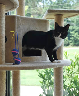 When cats first arrive, they are given a private double-sized cat condo. These digs are only temporary. This gives them a safe place where they can destress from the car ride and get acclimated to the smells and sounds of Kitty City. For most cats this "de-stressing period" lasts between one hour to one day. Once we see that the cat is comfortable and is meowing, rubbing on the front of the condo, and let's us handle them, we then allow them to come and explore with the other cats in Kitty City. For cats that remain shy and nervous, we continue to allow them private accommodations in the condos. Our goal is to do what is best for each individual cat that visits.